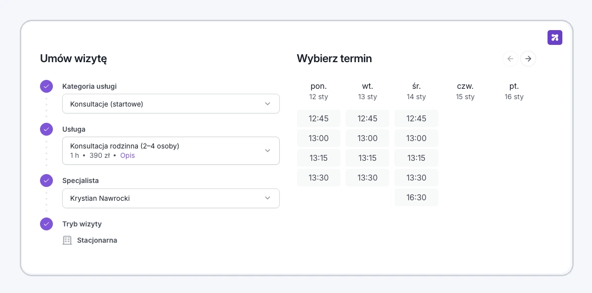 Nie. Konfiguracja jest prowadzona krok-po-kroku: usługi, dostępność, zasady zmian terminów, komunikacja oraz widget rezerwacji.
