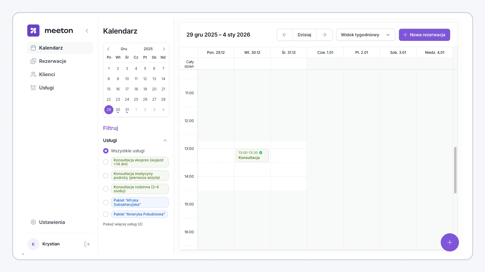 meetOn łączy moduł rezerwacji (widget) z panelem do obsługi klientów i grafiku — w jednym, spójnym procesie.